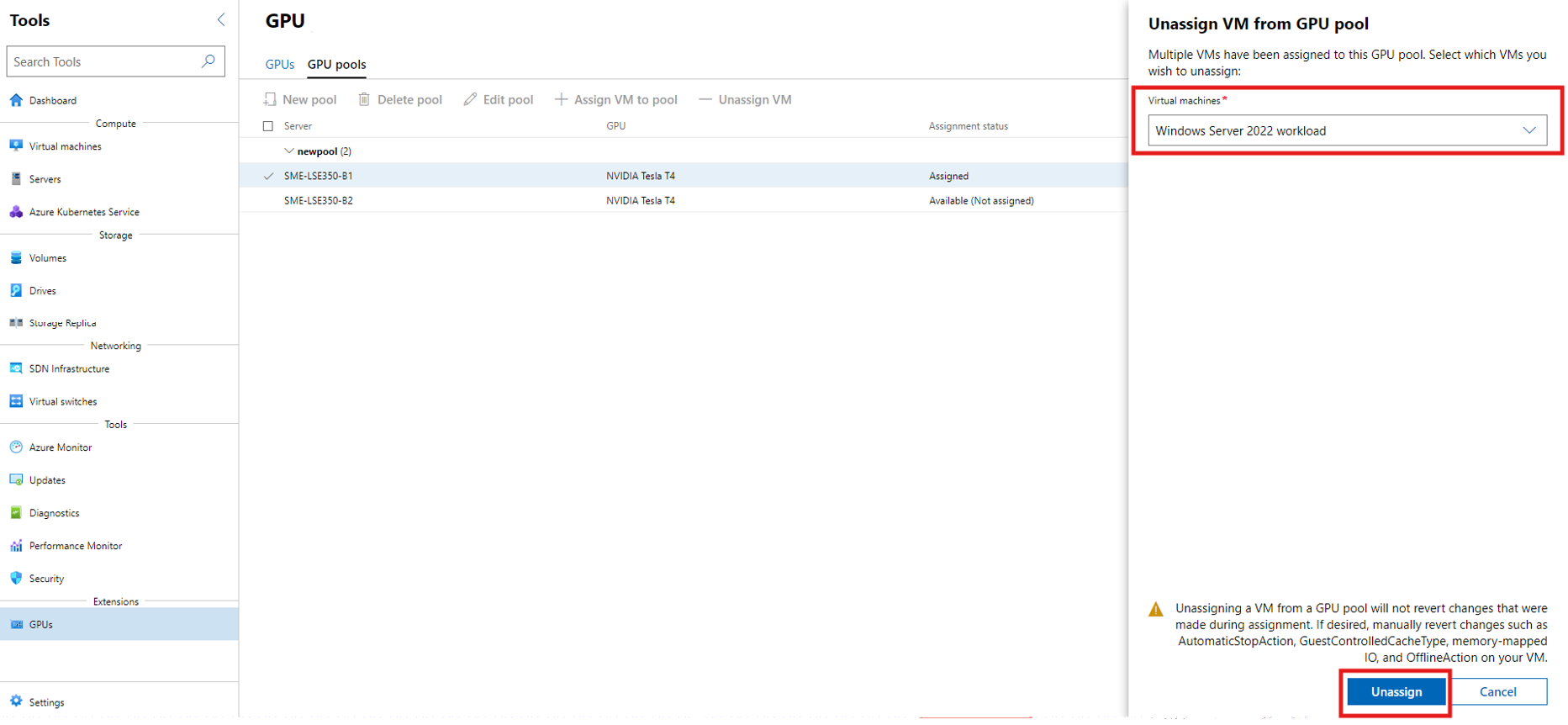 On the Unassign VM from GPU pool page, in the Virtual machines list box, specify the name of the VM, and then select Unassign.