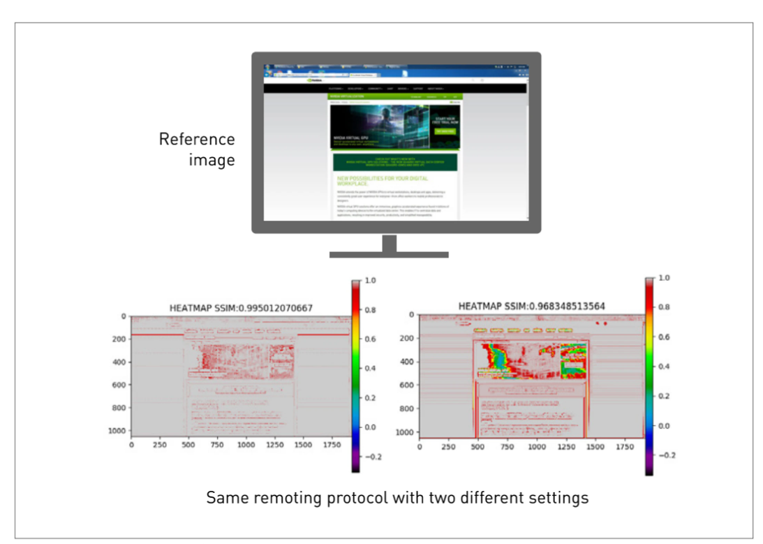 NVIDIA’s nVector benchmarking tool uses a lightweight agent on the VDI desktop and the client to measure image quality. These agents take multiple screen captures on the VDI desktop and on the thin client to compare later. The Structural Similarity Index Measure (SSIM) is a metric used to quantify the visual similarity between two images. The structural similarity (SSIM) of the screen capture taken on the client is computed by comparing it to the one taken on the VDI desktop. When the two images are similar, the heatmap will reflect more colors above the spectrum shown on its right with an SSIM value closer to 1.0 (Figure 7). As the images become less similar, the heatmap will reflect more colors down the spectrum with a value less than 1.0. More than a hundred pairs of images across an entire set of user sessions are obtained. The average SSIM index of all pairs of images is computed to provide the overall remote session quality for all users. Poor image quality, under 0.90, can cause issues with text display, line sharpness, and other graphical issues. The threshold SSIM value is 0.98; scores above 0.98 indicate good image quality, with 1.0 perfect.