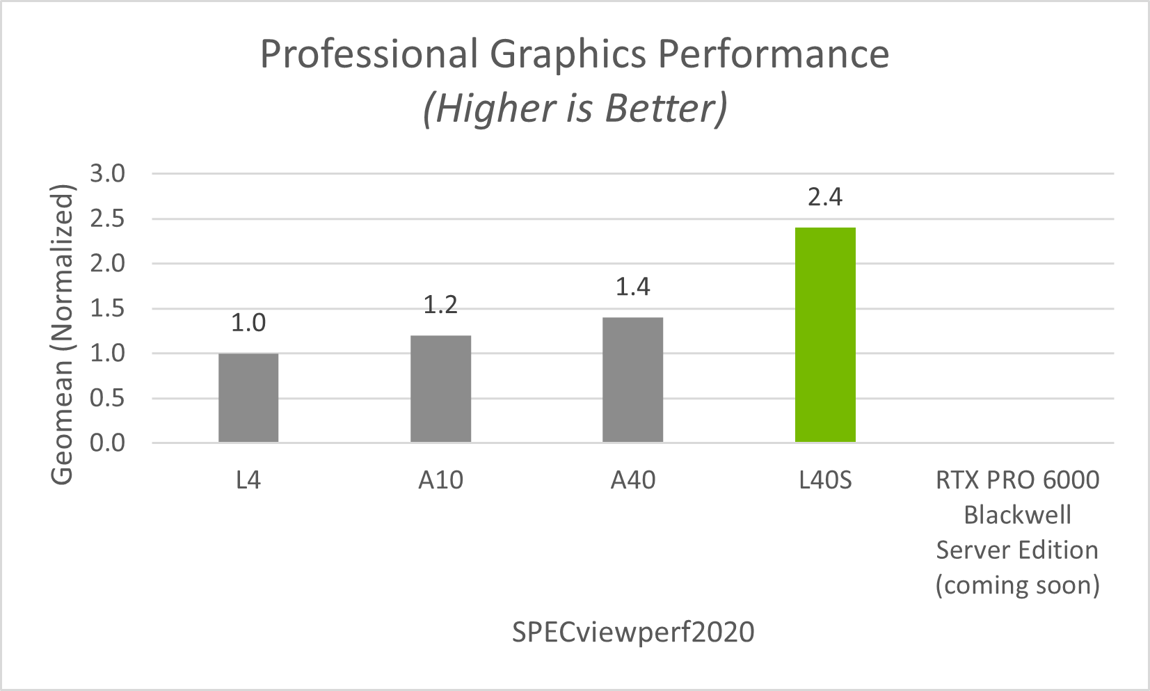 GPU performance for professional graphics workloads was measured by using the SPECviewperf 2020 (3840x2160) benchmark test. SPECviewperf 2020 is a standard benchmark for measuring the graphics performance of professional applications. It measures the 3D graphics performance of systems running under the OpenGL and DirectX application programming interfaces.