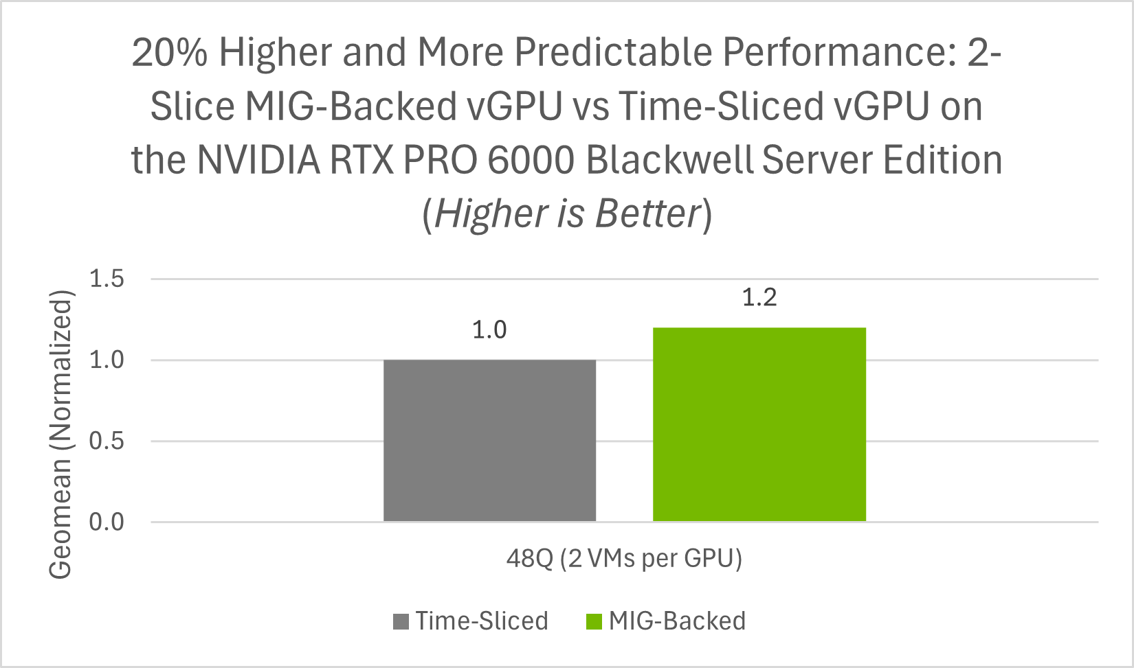 Based on SPECviewperf 15 results, Figure 3 shows that, at the 48 GB profile size, MIG-backed vGPU delivered 20% higher performance than time-sliced vGPU. This improvement is due to MIG’s hardware partitioning of GPU resources, which provides stronger resource isolation, more predictable performance, improved resource utilization, and better quality of service (QoS) than time-sliced vGPU.