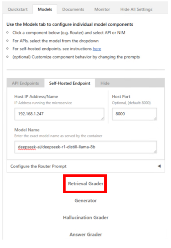 Experiment with the self-hosted endpoint options to utilize other models by adjusting the NIM startup script, or by exercising the local model with other parts of the workflow (Generator, Answer Grader, etc.). Consider how other models perform regarding various chat prompt tasks.