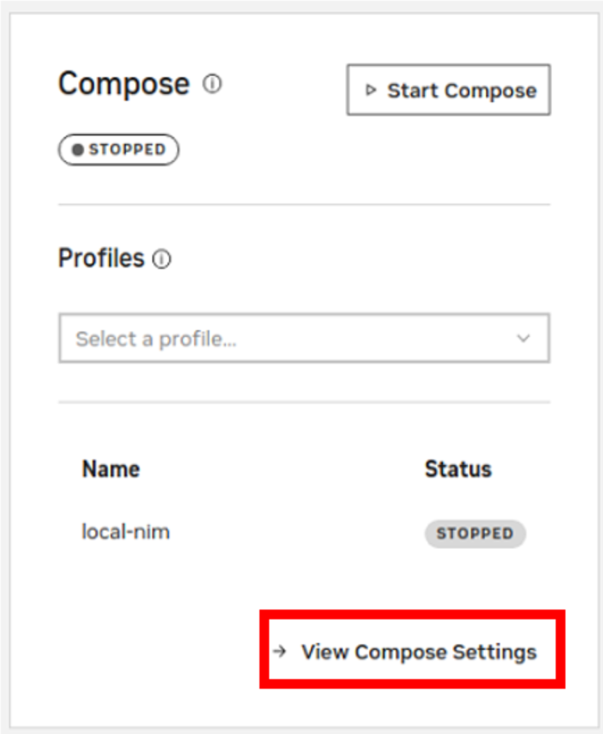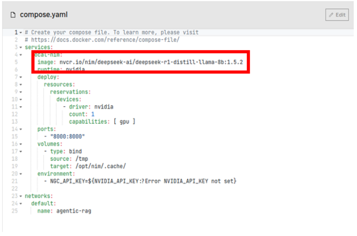 Adjust the compose file to suit the NGC repo and model as required. In this example, the same model is used as shown in the manual example, previously. Adjust and save the compose file when completed.