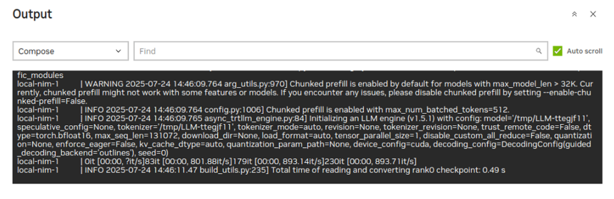 The process will take some time to fully start the model which is packaged as a NIM. Follow the container processes in a console shell. Verify “Application startup complete” in the compose status output.