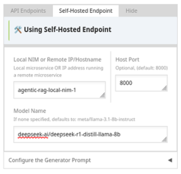 When the NIM is fully running, Open the Chat application and navigate to Models->Self-Hosted Endpoint->Generator. Adjust the Local NIM, Port, and Model name to address the local NIM.
