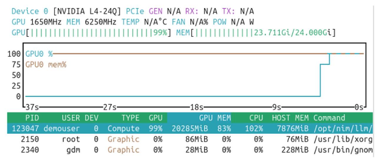 A GPU monitoring tool can help verify the local GPU utilization when issuing a chat prompt. Note the compute and memory utilization when the agent model is processing.