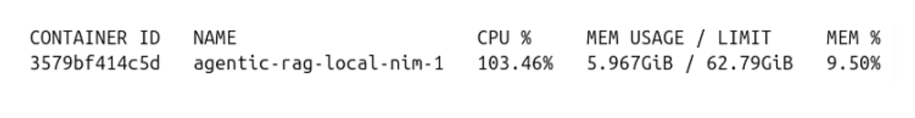 Docker provides a container statistic utility for container utilization monitoring. Note the utilization when the agent model is processing.