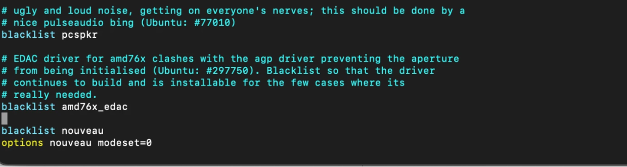 $ sudo vim /etc/modprobe.d/blacklist.conf $ blacklist nouveau $ options nouveau modeset=0