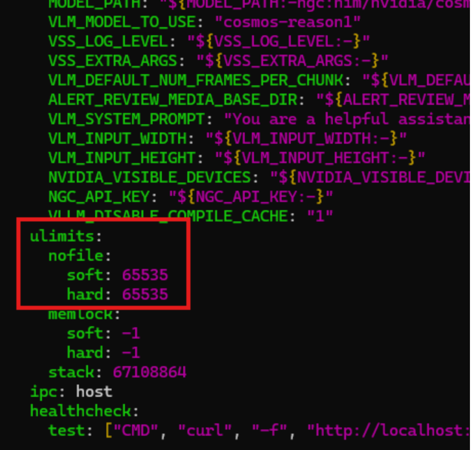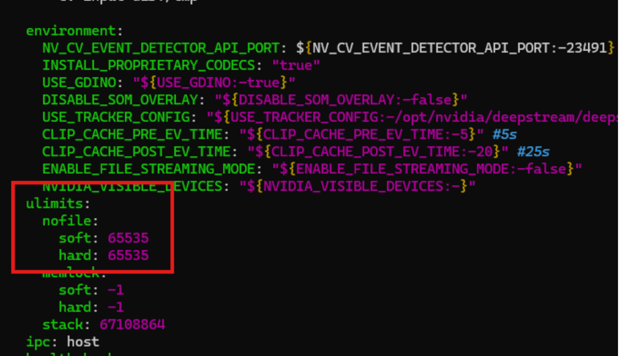 For this project, we will need to increase the number of open files. Edit the compose.yaml file and add the following lines in the services/via-server/ulimits section: