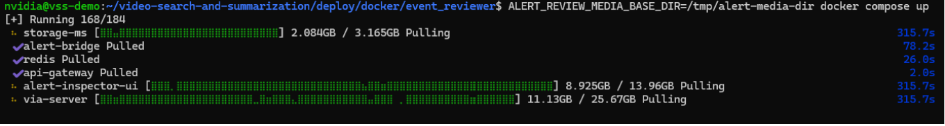 Launch the complete VSS Event Reviewer stack including Alert Bridge, VLM Pipeline, Alert Inspector UI, and Video Storage Toolkit. Depending on your Internet connection, this could take 20 to 30 minutes to process.