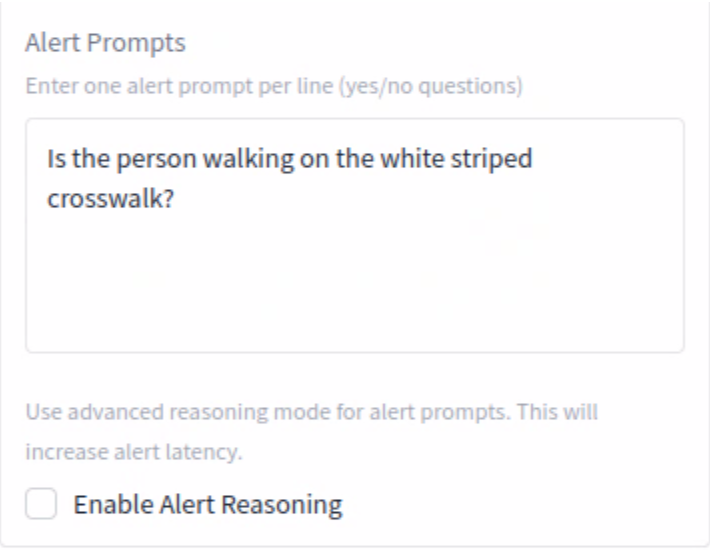 Alert Prompt - We are telling the agent what we want it to alert on, in this case, if it detects a person, are they using the crosswalk?