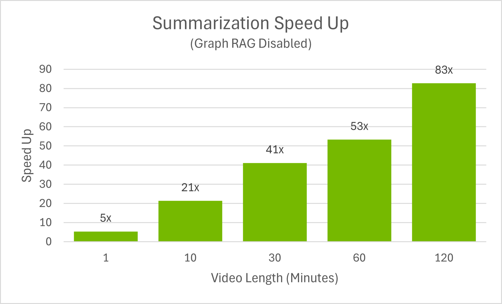 From the data, the summarization speed up can be plotted. This is summary generation time compared to the length of the video to show how much faster VSS is to generate summaries compared to manually watching the full video.