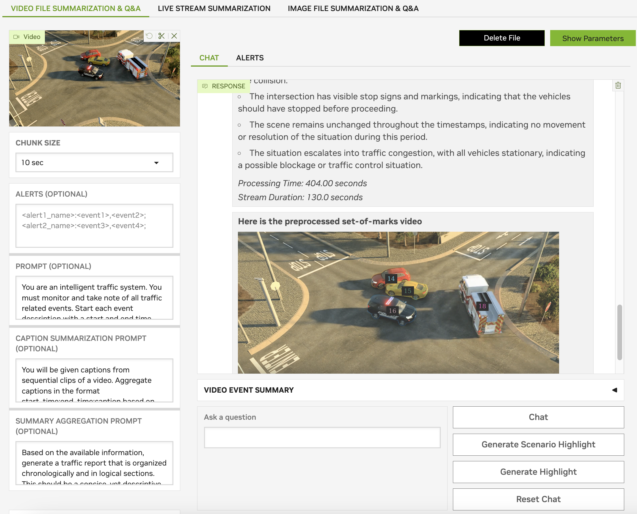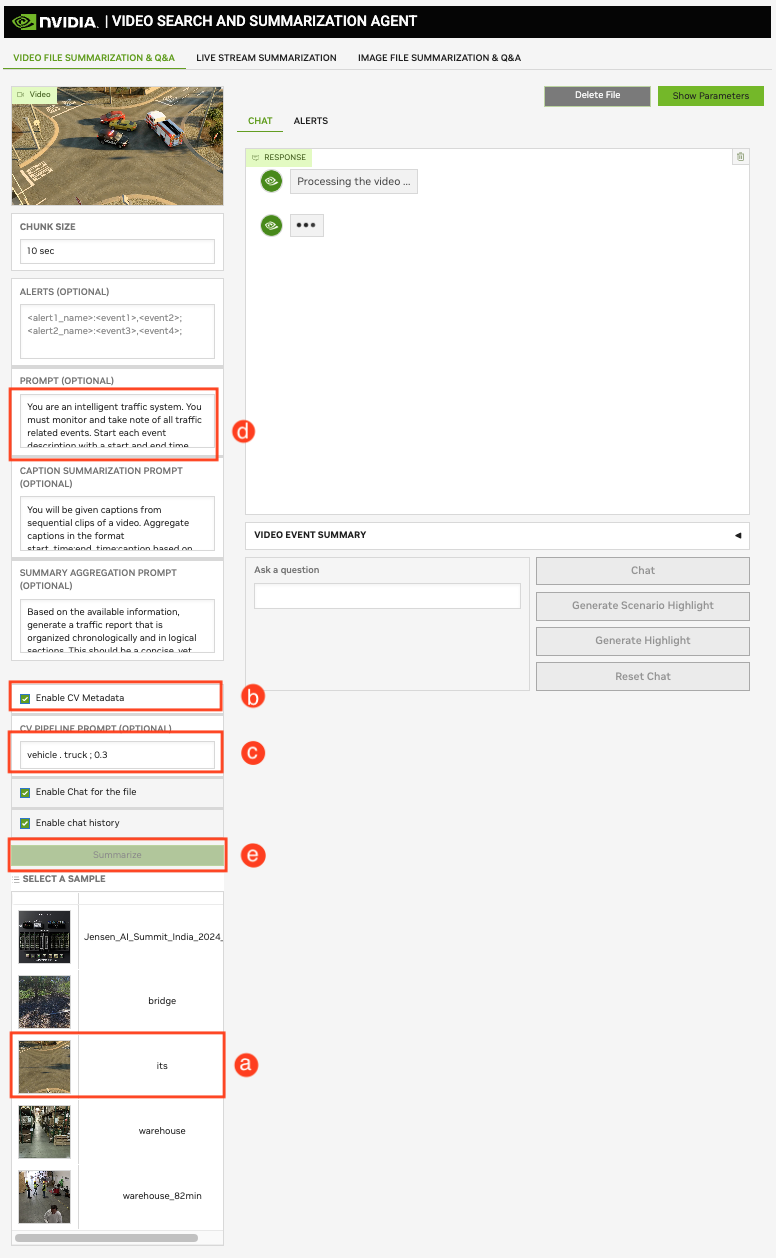 vehicle . truck;0.3. Set the prompt to: Traffic Camera Video (its) (With “Enable CV Metadata” Selected). Click on the Summarize button.
