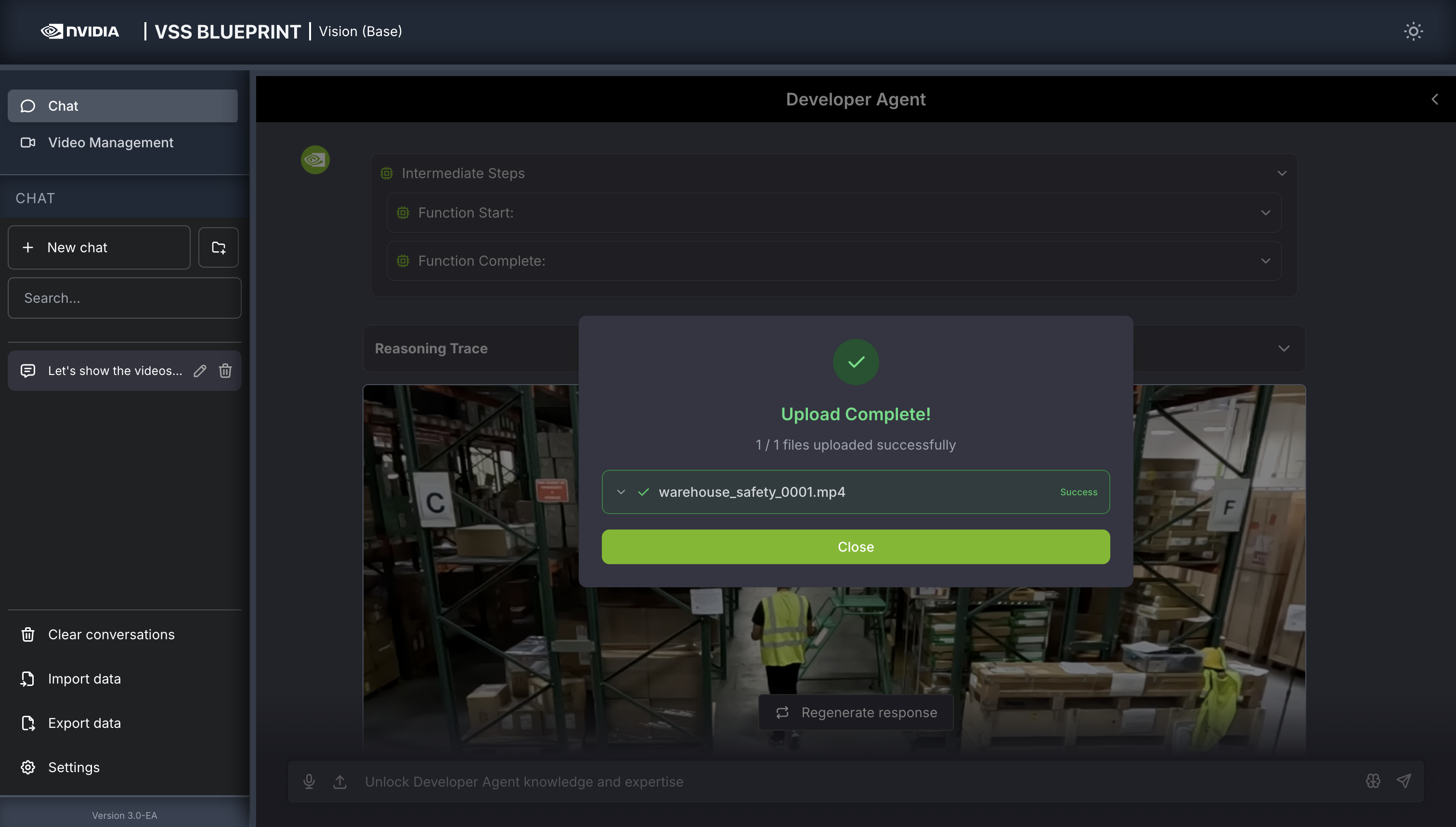 This guide will walk you through the steps to deploy a vision agent using the VSS Blueprint. You’ll create a simple vision agent that you can upload videos to, ask questions about the videos, and generate reports. Afterwards, you can explore adding agent workflows such as video summarization, search, and alerting.