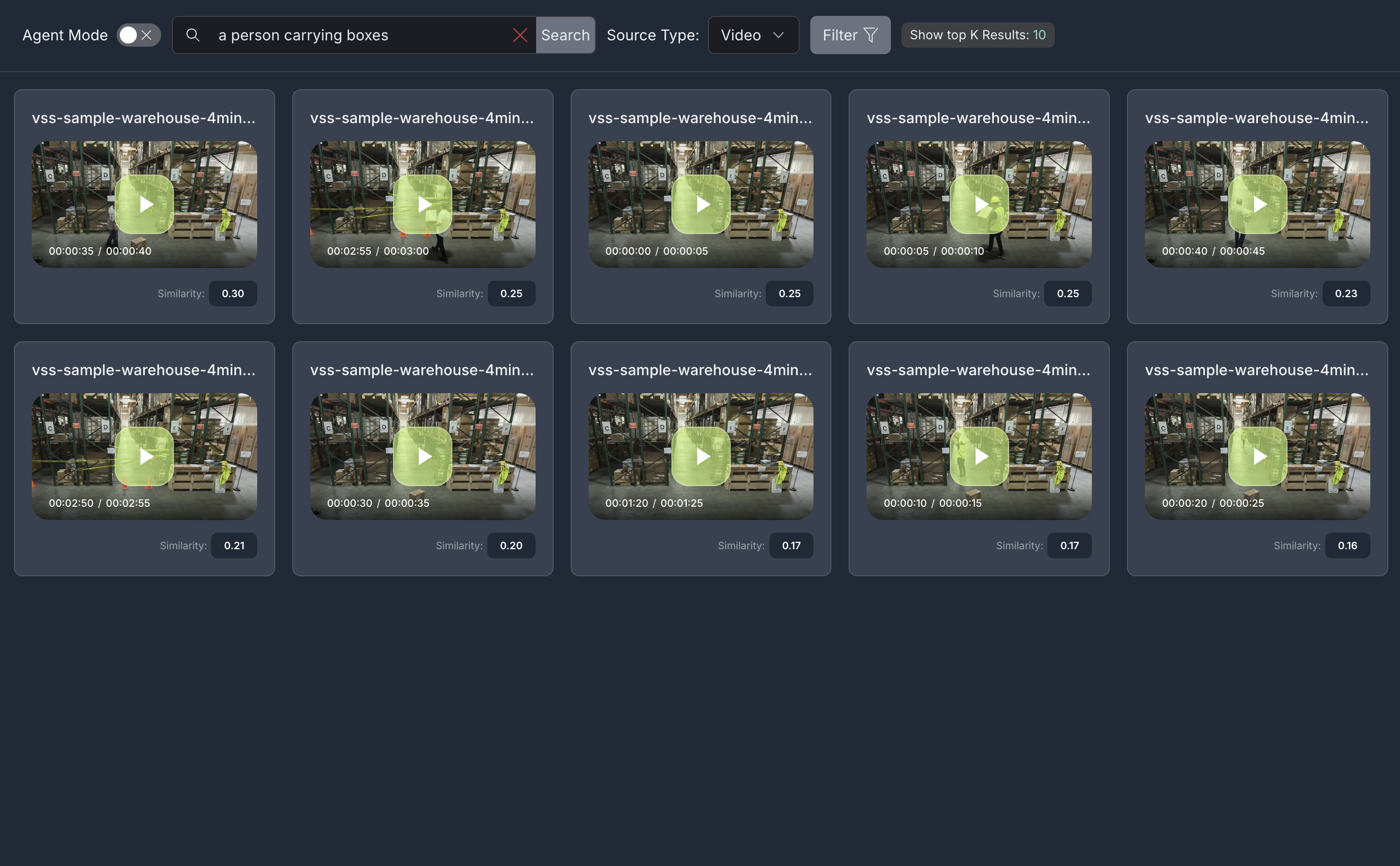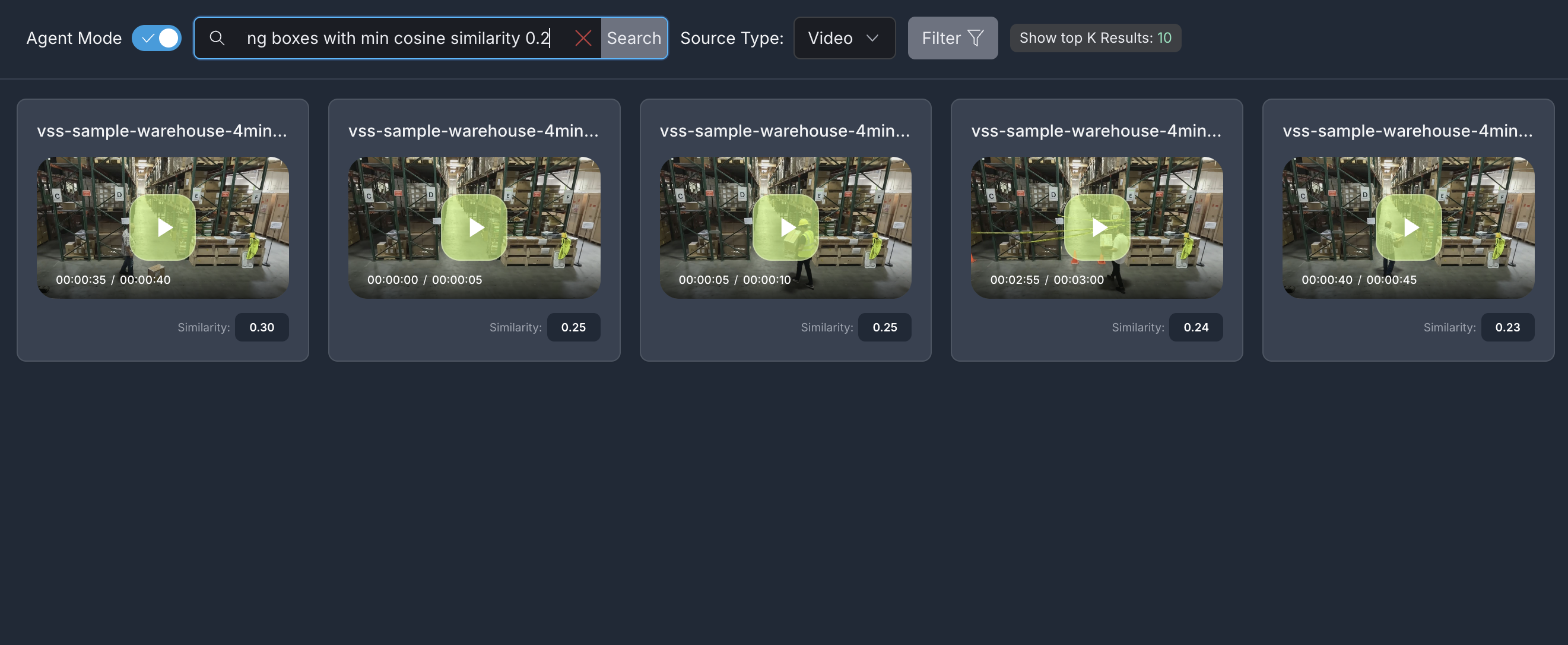 Click the Search button to execute the query. The agent will return video clips that match your search description.