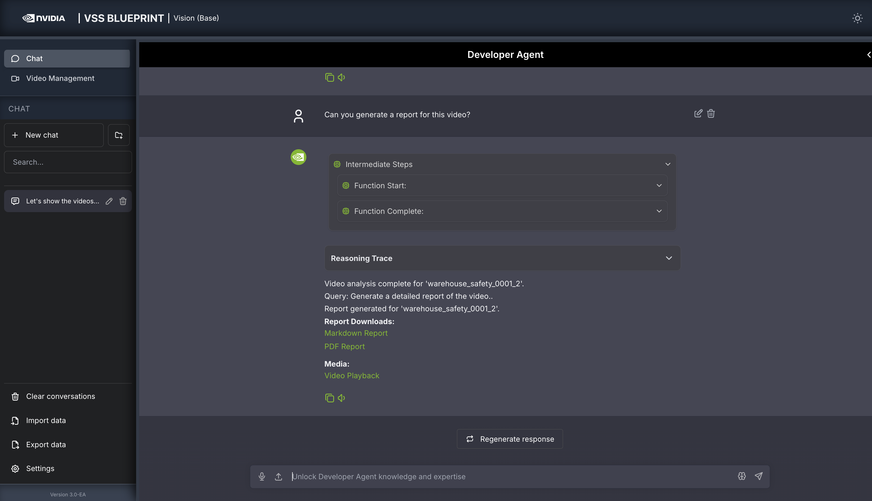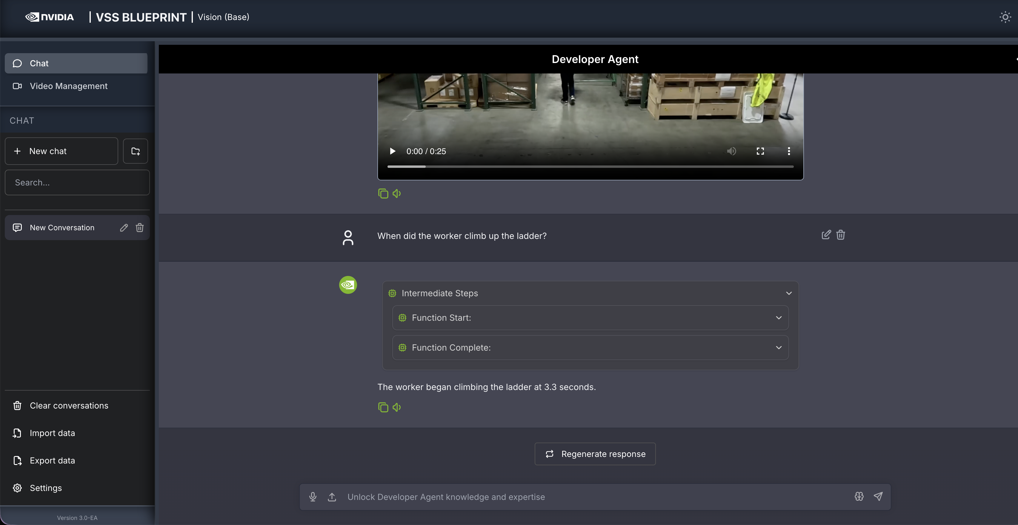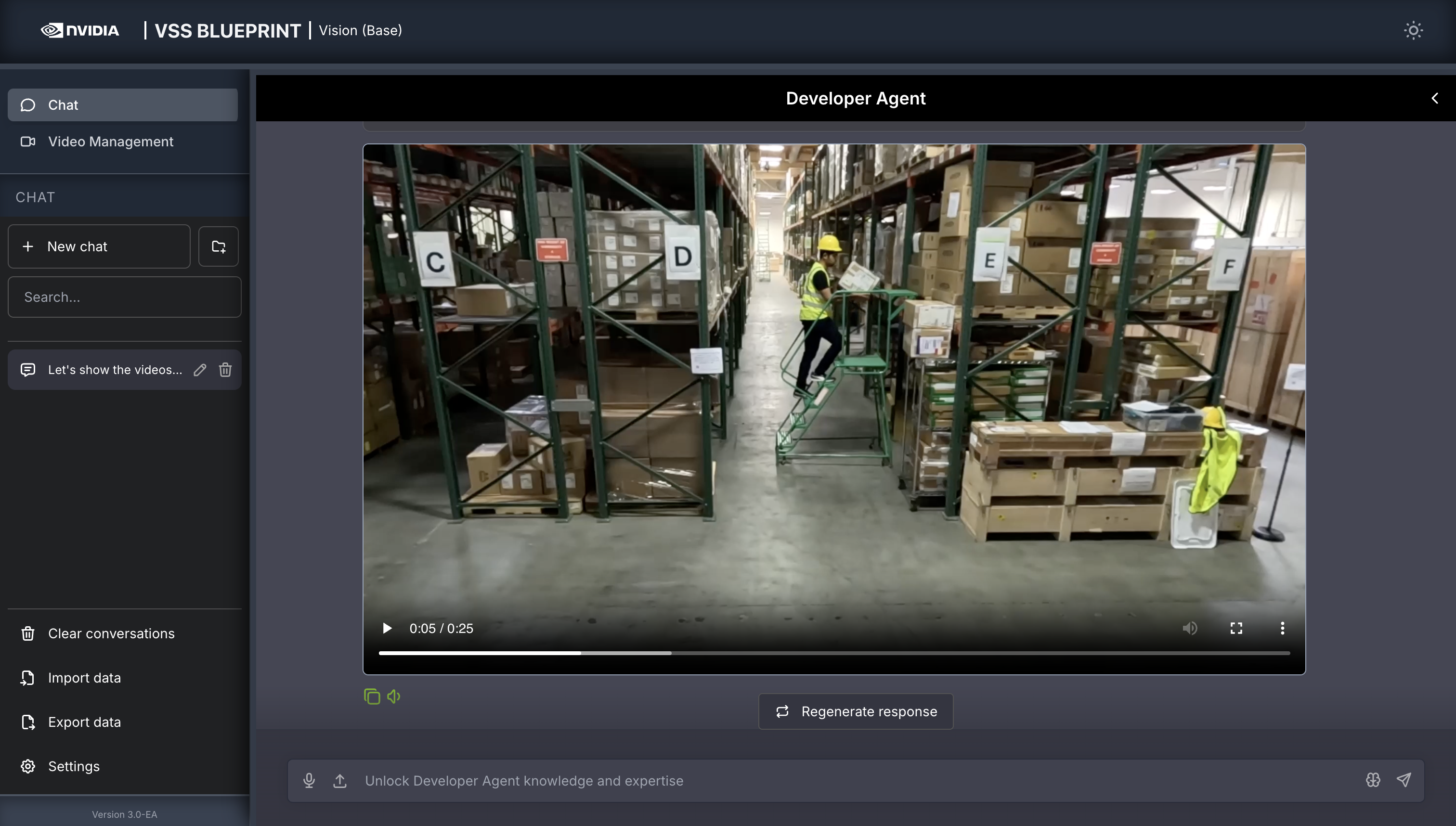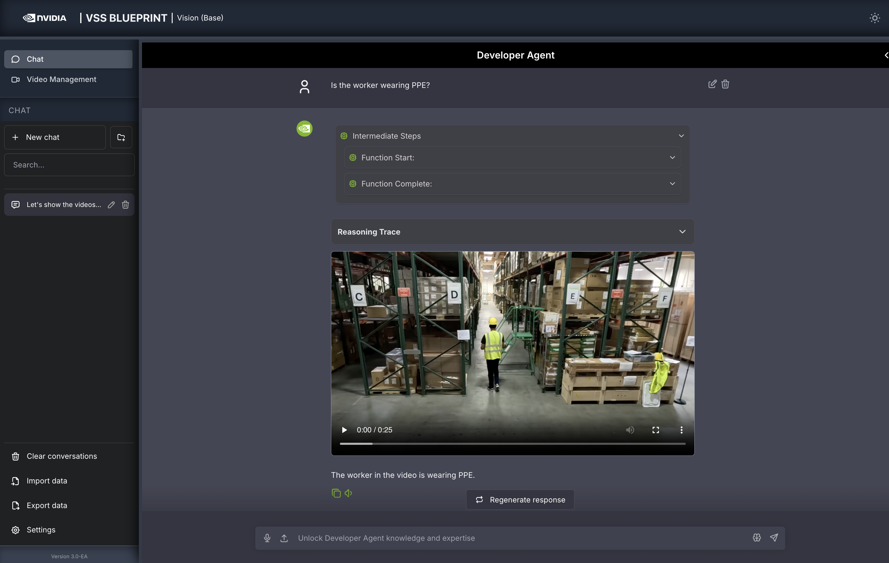 This guide will walk you through the steps to deploy a vision agent using the VSS Blueprint. You’ll create a simple vision agent that you can upload videos to, ask questions about the videos, and generate reports. Afterwards, you can explore adding agent workflows such as video summarization, search, and alerting.