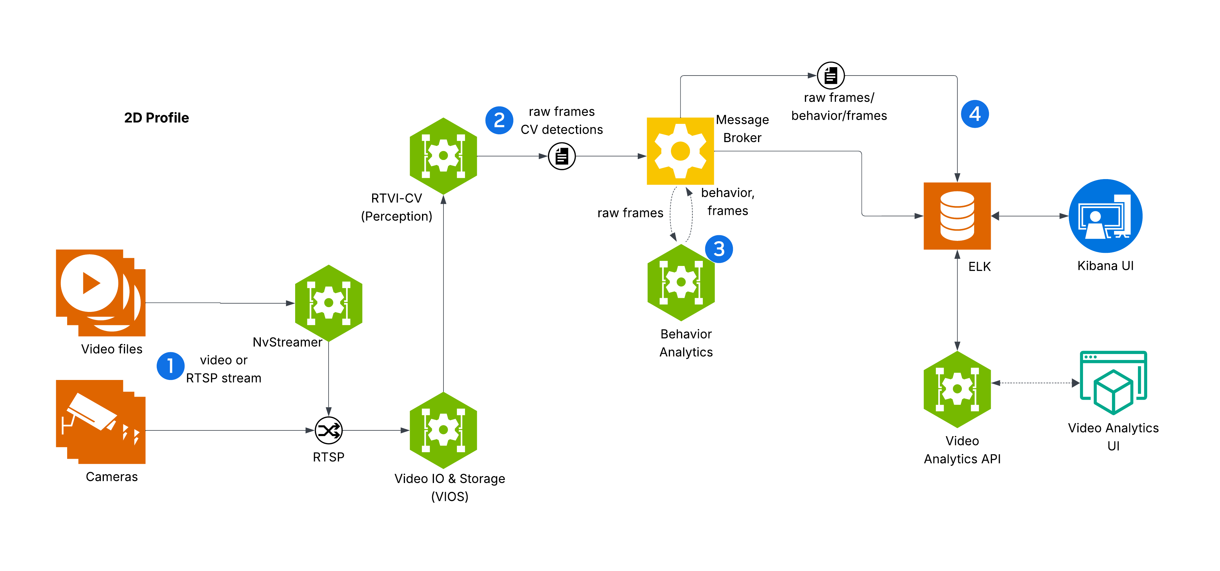 Microservices: Components like NvStreamer, VIOS, DeepStream, and Behavior Analytics are modular microservices.