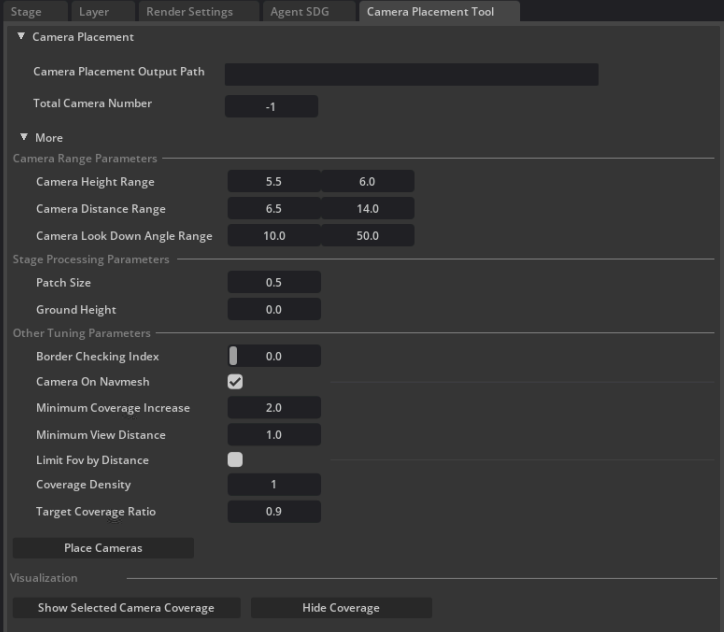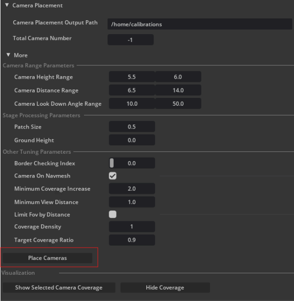 Set the Camera Placement Output Path and the Total Camera Number (Minimum number of cameras required to cover the scene when Total Camera Number = -1) in Camera Placement Section.