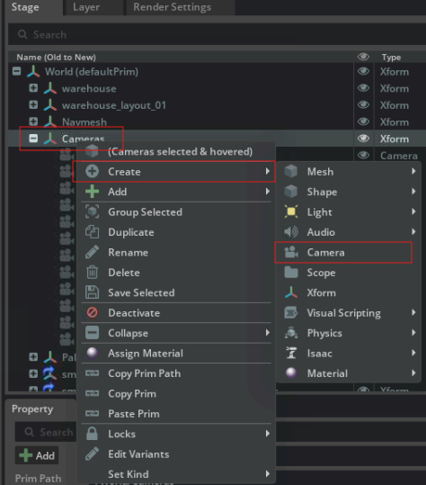 Create Xform prim by Stage > World > Right Click > Create > Xform and then rename it to Cameras.