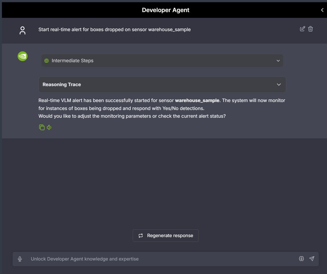 • Sample prompt: Start real-time alert for boxes dropped on sensor warehouse_sample