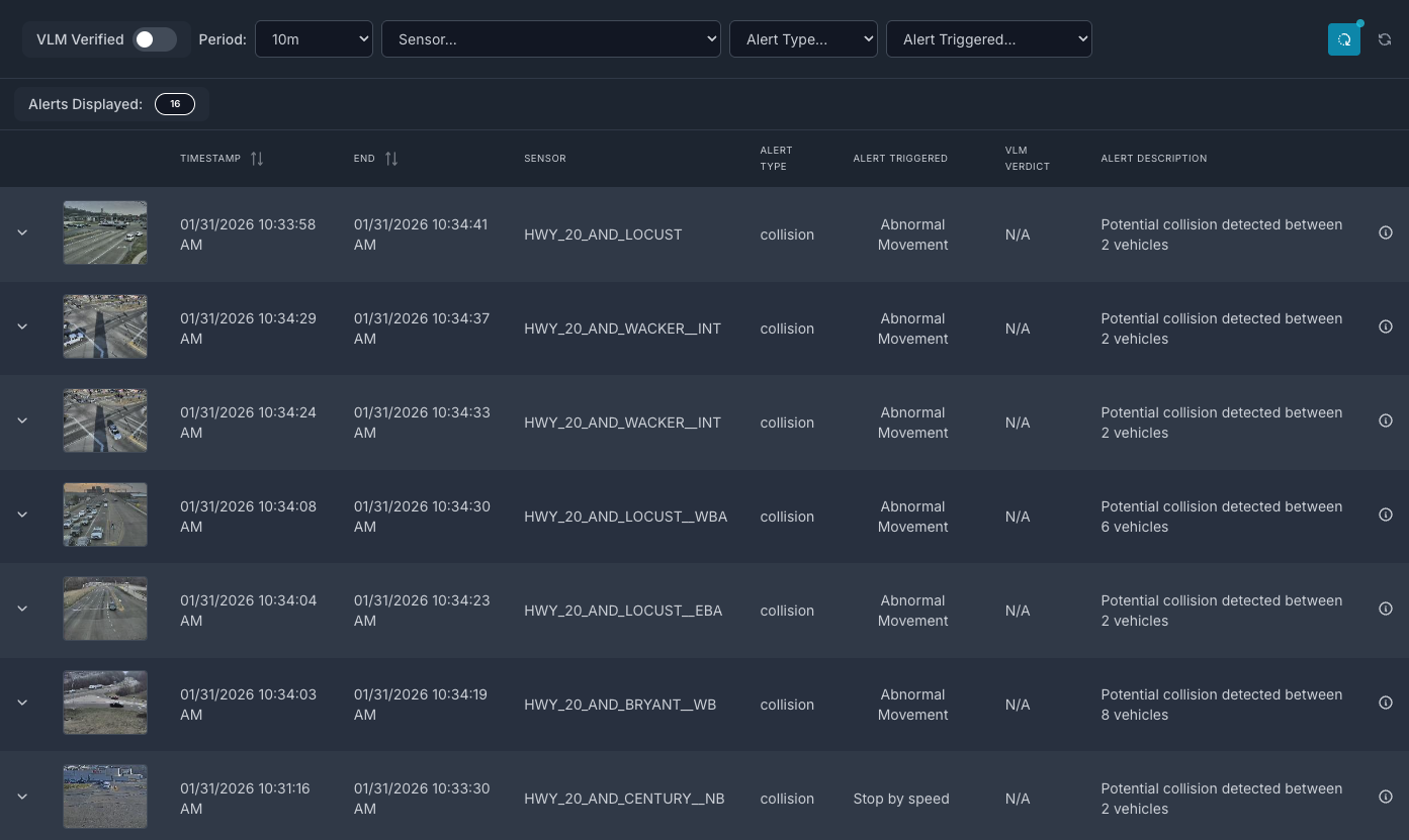 Alerts Table - Sortable table displaying incidents with video playback and metadata