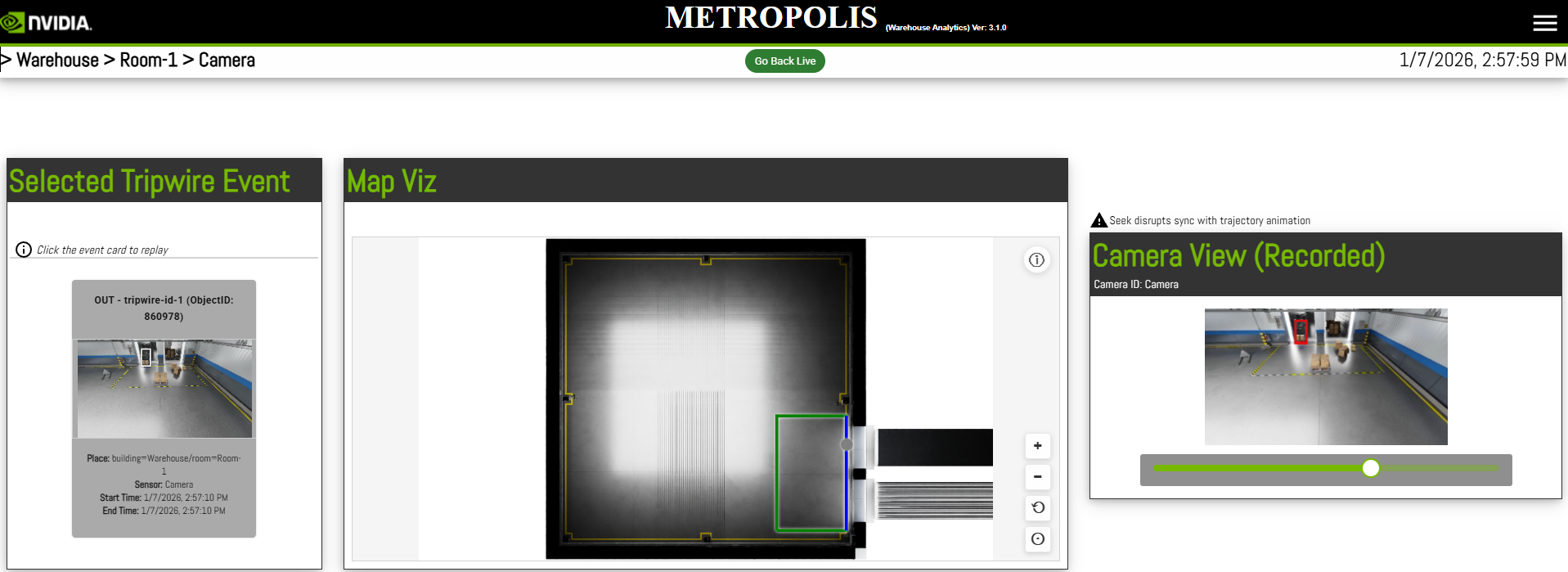 We provide a sample browser-based user interface for visualizing the moving objects, live camera feeds along with events and metrics. Details can be found in Reference Video Analytics UI.