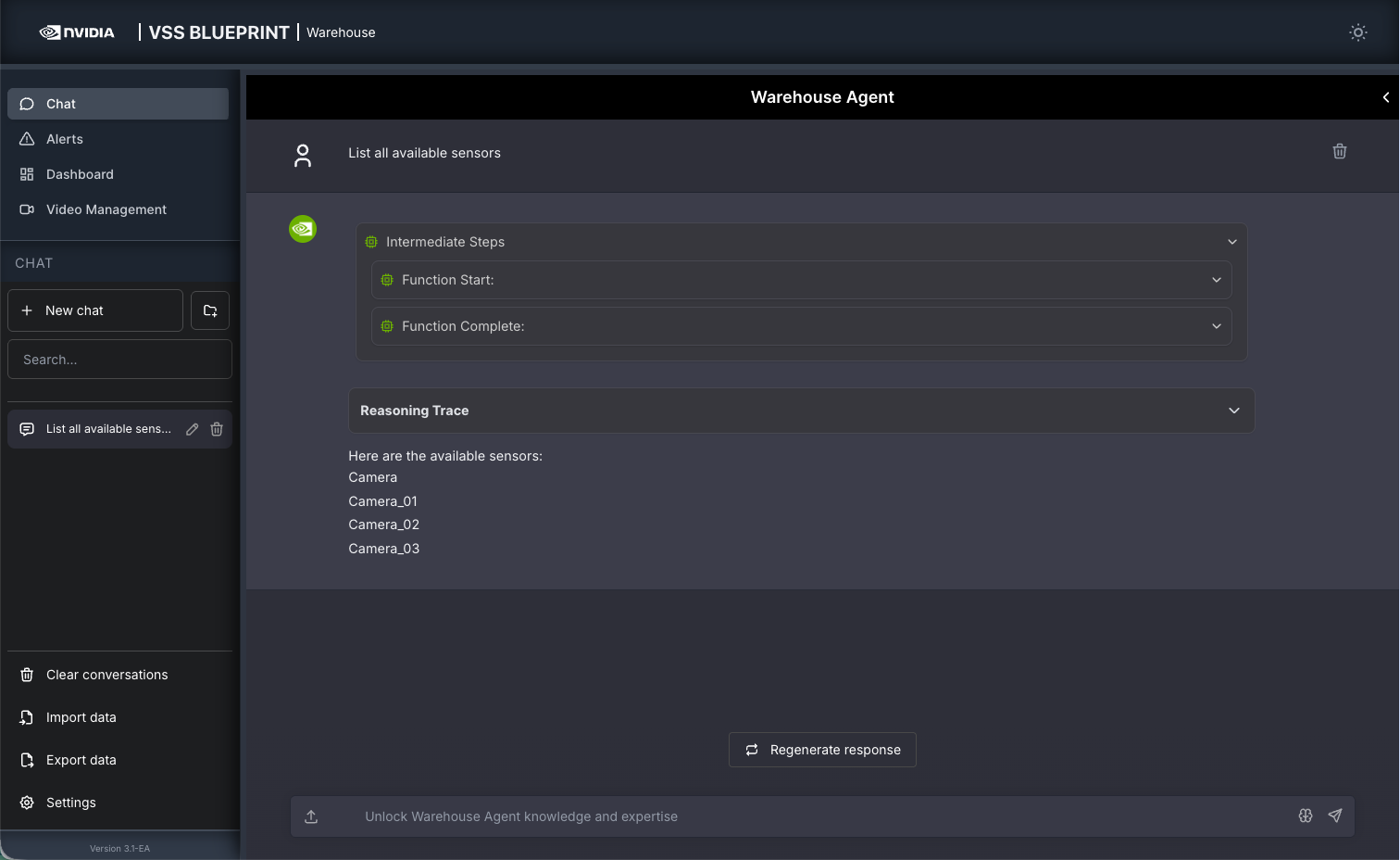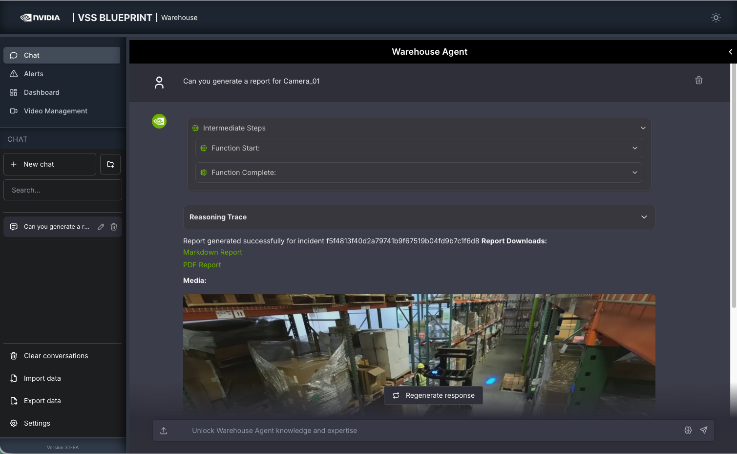 The Warehouse Blueprint incorporates an agentic AI system that provides natural language interaction capabilities for querying warehouse safety incidents, generating reports, and retrieving visual information from warehouse cameras.