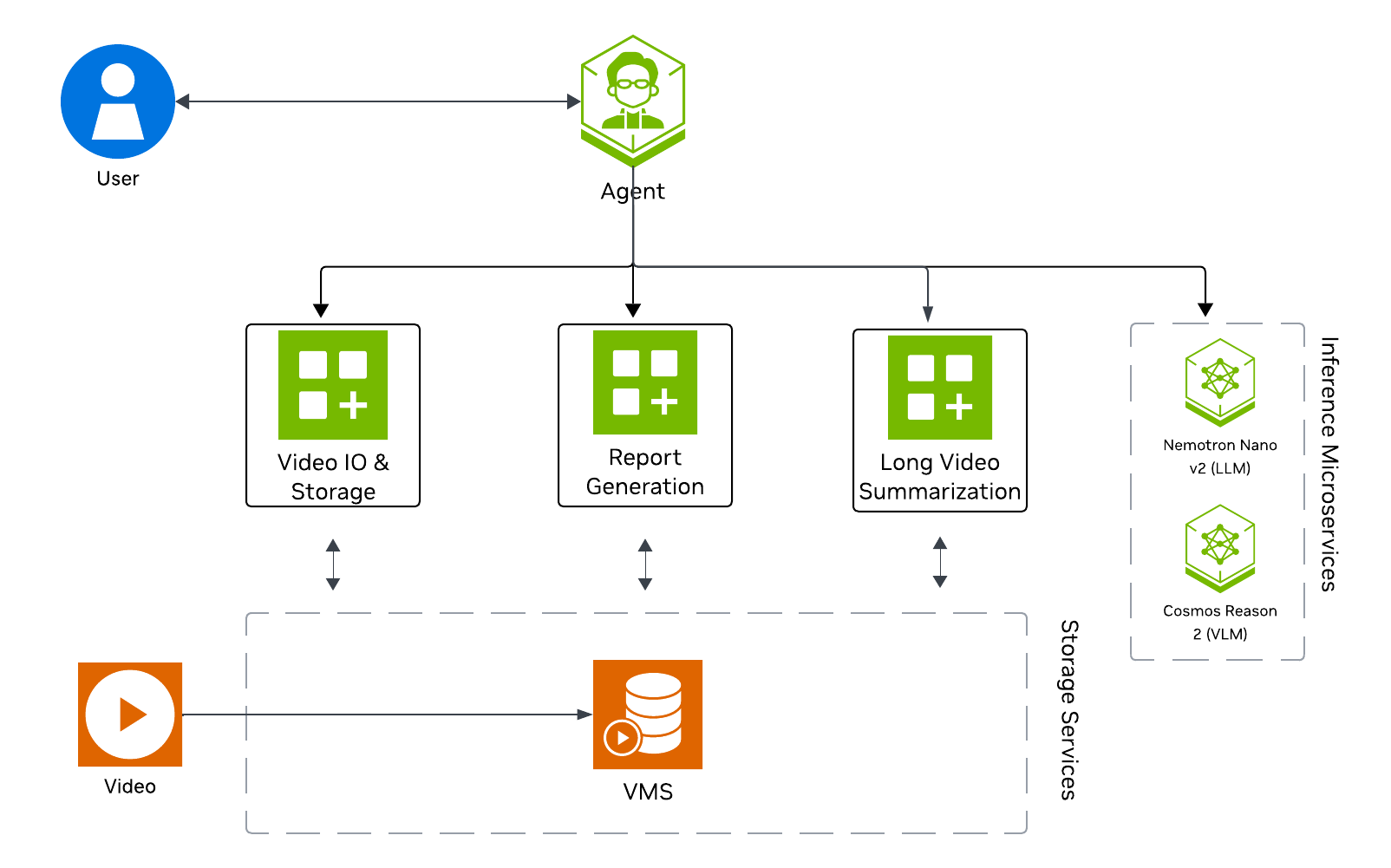 VSS Agent: Agent service that orchestrates tool calls and model inference to answer questions and generate outputs