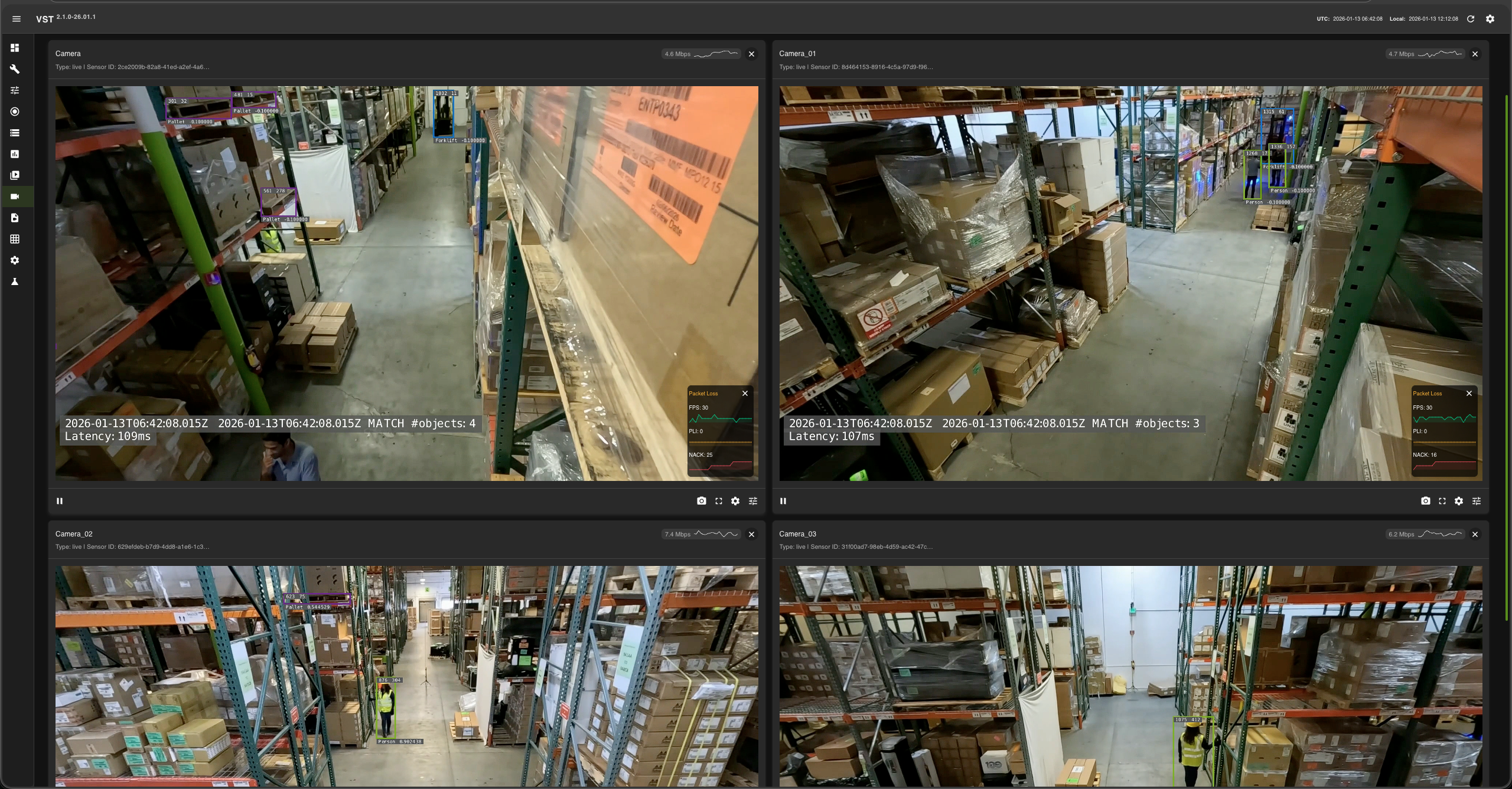 DeepStream processes RTSP streams for 2D single-camera detection and tracking, utilizing the RT-DETR (Real-Time Detection Transformer) model (link) to generate precise 2D bounding boxes for diverse objects including people, humanoid robots, autonomous vehicles, and warehouse equipment.