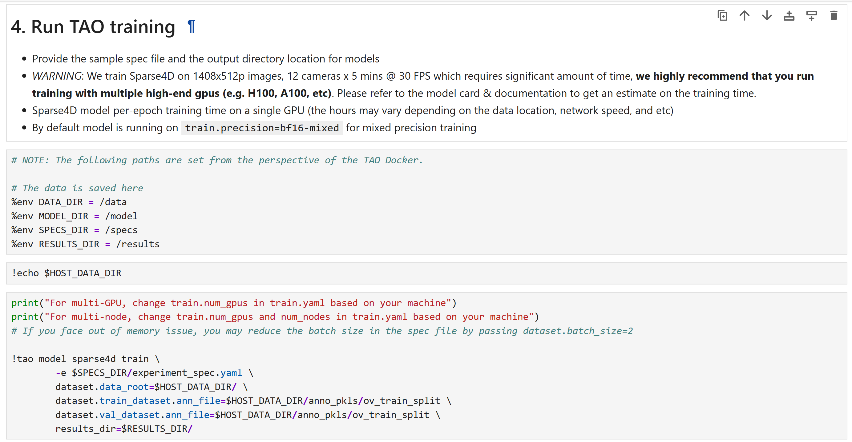 The documentation provided below accompanies the cells in the TAO fine-tuning notebook and offers guidance on how to execute them. TAO Sparse4D supports the following tasks via the Jupyter notebook: